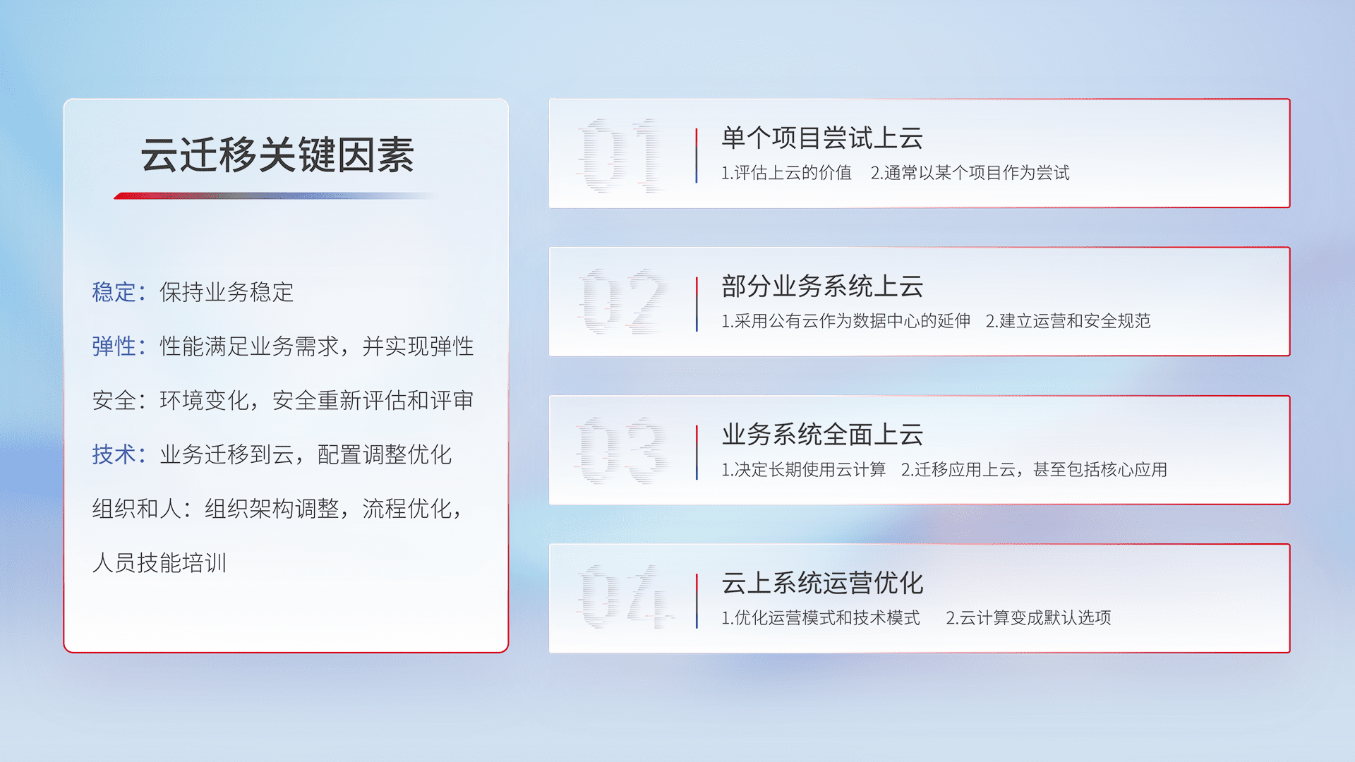 结合实际业务,,,,从规划设计、、、、云平台选型、、云原生改造、、、数据迁移、、集成交付,,,迁移全过程为客户识别最佳上云路径,,,做好风险识别管理,,设计网络架构、、身份权限、、安全审计合规、、操作审计、、、日志审计、、、、监控告警策略、、、、多站点容灾设计等,,,,对云上基础设施进行整体规划,,,提升IT治理水平,,,,以满足弹性、、高可用、、、高性能的需求。。