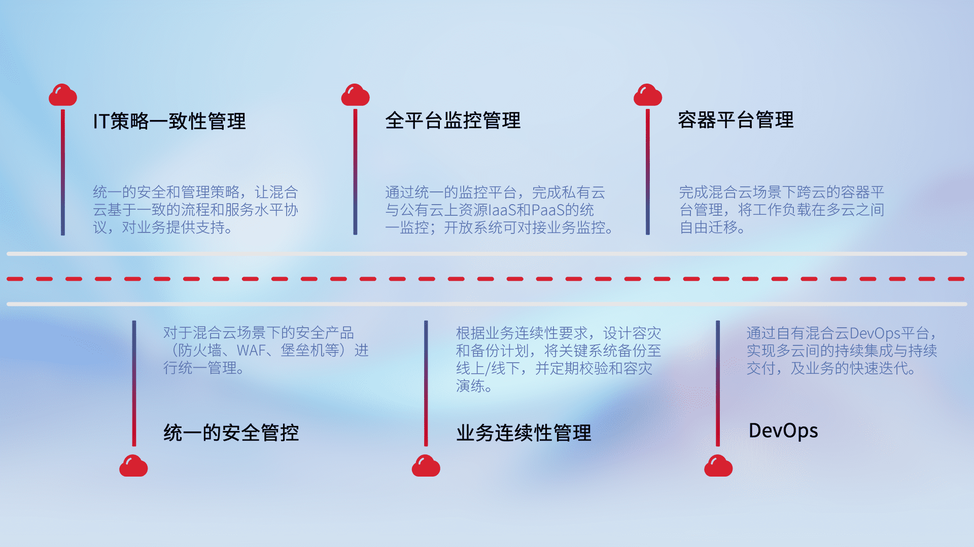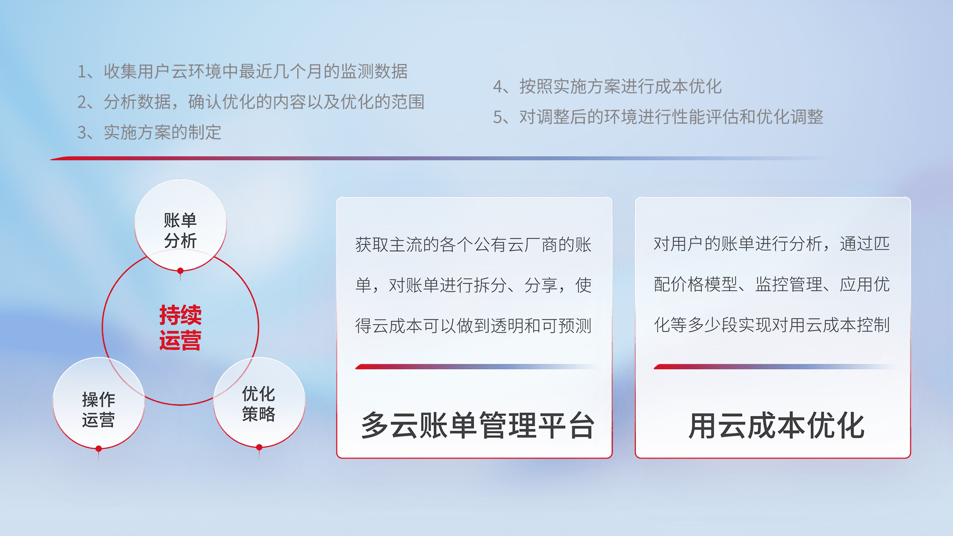 通过多云纳管,,,,以统一的资源数据模型把客户的云资源进行抽象和封装,,,进而实现对多云资源的统一操作,,,,保障云资源管理的可靠性、、稳定性与可用性。。量身定制化运维内容,,,配置、、开发运维、、补丁管理、、备份、、监控、、、认证和访问管理、、、、审计和日常巡检等,,,,保障在用云过程中的可靠度,,,稳定度以及高可用率。。。