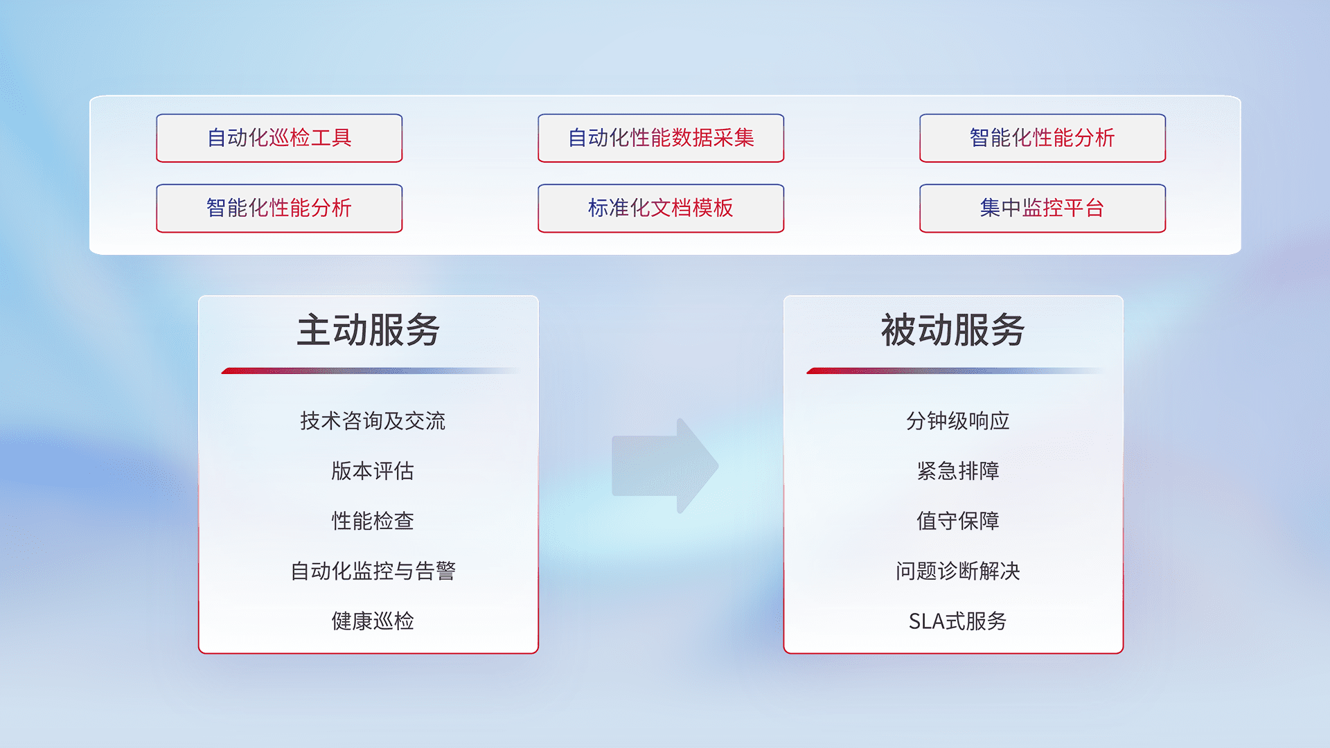 智能化工具和标准化文档,,,,保障服务质量,,提供主动服务(包含技术咨询、、、、版本评估、、性能检查、、、、自动化监控与告警、、健康巡检)和被动服务包含(分钟级响应、、、紧急排障、、、值守保障、、、问题诊断解决、、SLA服务)。。。。